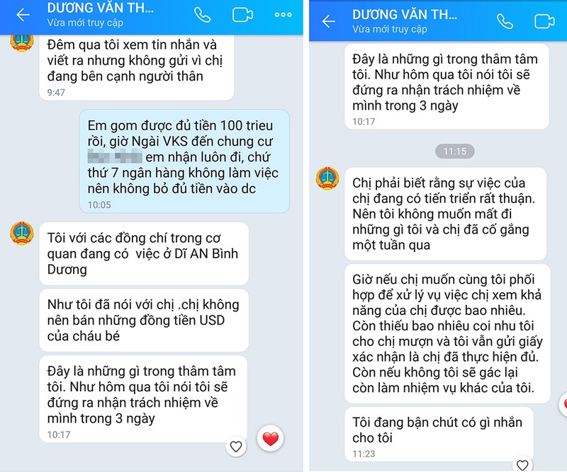 Người này nói bổn phận là bảo vệ người dân. Qua điều tra thì thấy chị có vẻ bị oan nên khuyên hãy an tâm, xem xét có con nhỏ nên sẽ cho tại ngoại. Đổi lại chị phải giữ bí mật, làm theo đúng hướng dẫn.