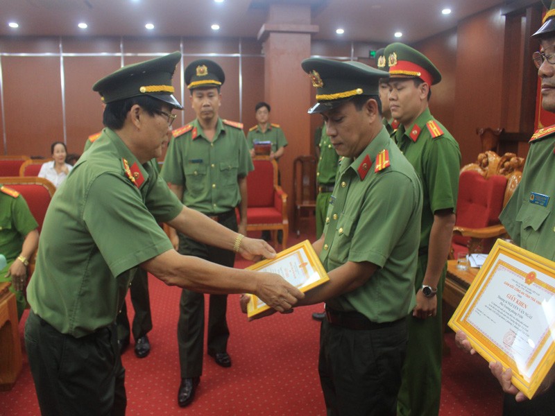 Ban giám đốc Công an tỉnh Trà Vinh trao thưởng cho các cá nhân có thành tích phá nhanh vụ án.